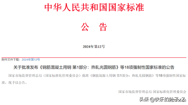 6月25日,国家标准化管理委员会发布第12号公告(关于批准发布《钢筋混凝土用钢 第1部分:热轧光圆钢筋》等18项强制性国家标准的公告),批准《钢筋混凝土用钢 第1部分:热轧光圆钢筋》等18项强制性国家标准。GB/T 1499.1-2017(钢筋混凝土用钢 第1部分:热轧光圆钢筋)等六部标准由推荐性标准变为强制性标准。