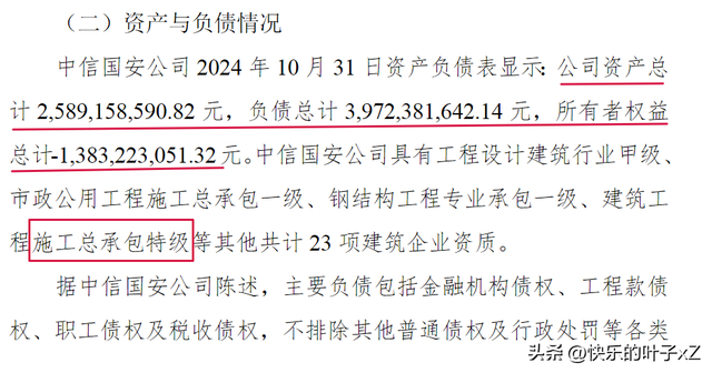 中信国安公司2024年10月31日资产负债表显示:公司资产总计25.89亿元,负债总计39.72亿元,所有者权益总计-13.83亿元。中信国安公司具有工程设计建筑行业甲级、市政公用工程施工总承包一级、钢结构工程专业承包一级、建筑工程施工总承包特级等其他共计23项建筑企业资质。