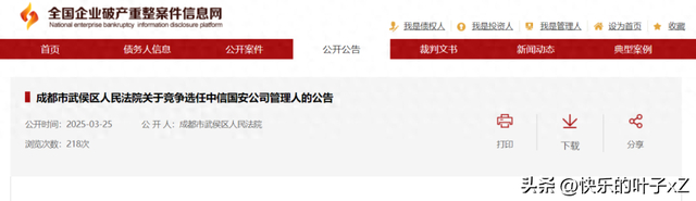 3月25日消息,成都市武侯区人民法院发布《关于竞争选任中信国安建工集团有限公司管理人的公告》。