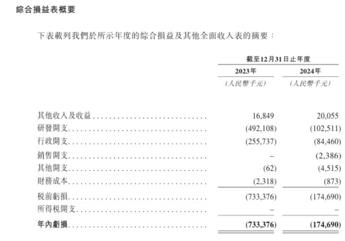 同时,公司行政开支分别为2.56亿元、8446万元。报告期内,公司尚未从产品销售中产生任何收入。于2023年及2024年,亏损分别为7.33亿元及1.75亿元,绝大部分的经营亏损乃由往绩记录期间的研发开支及行政开支所致。