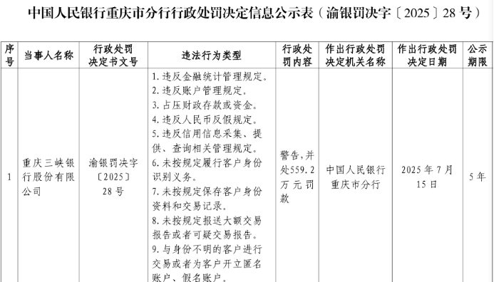 今年7月,重庆三峡银行股份有限公司因九项违法被警告并处559.2万元罚款。
