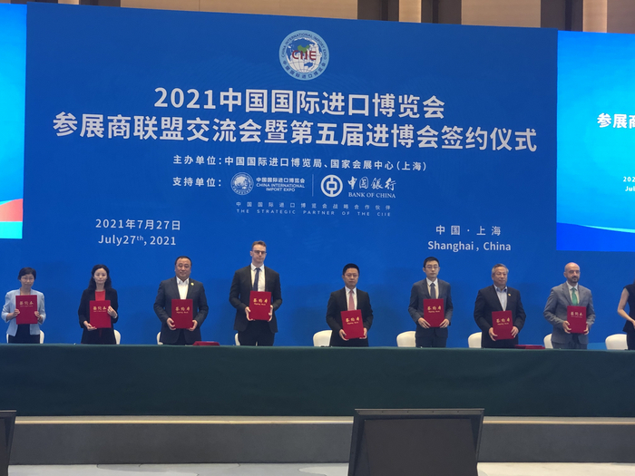 27日,在第四届进博会倒计时100天之际,2021中国国际进口博览会参展商联盟交流会暨第五届进博会签约仪式举行。欧莱雅、拜耳、米技、安永、汇丰等26家全球知名企业正式签约参加第五届进博会。