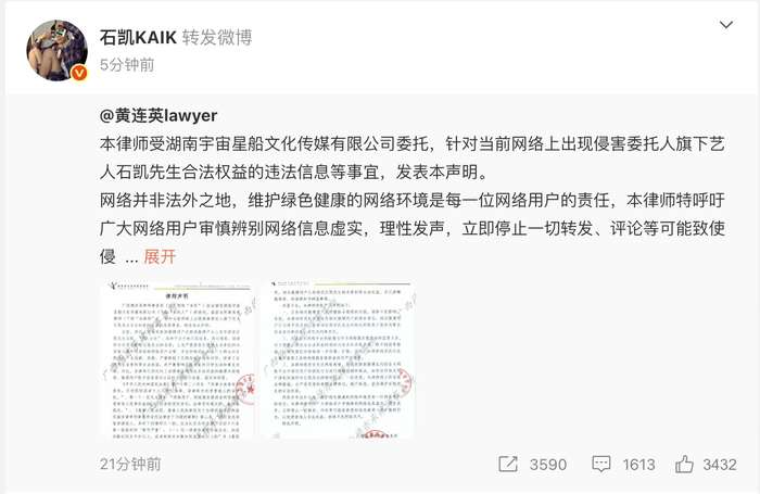 @石凯KAIK 转发律师声明,否认出轨,非和平分手等传言,表示对侵害自身合法权益的微博内容链接、微博用户账号信息通过公证的方式进行了收集、固定和保管。