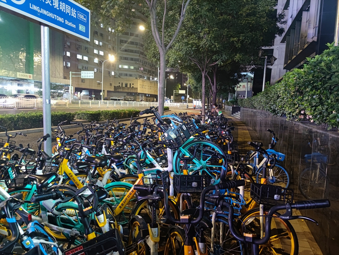 2021年7月28日,辟才胡同和西单北大街西北角的电子围栏里单车“叠罗汉”。