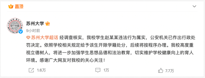 3月19日凌晨,苏州大学通报,经调查核实,学生赵某某违法行为属实,公安机关已作出行政处罚决定。依照学校相关规定给予该生开除学籍处分,后续将按程序办理。