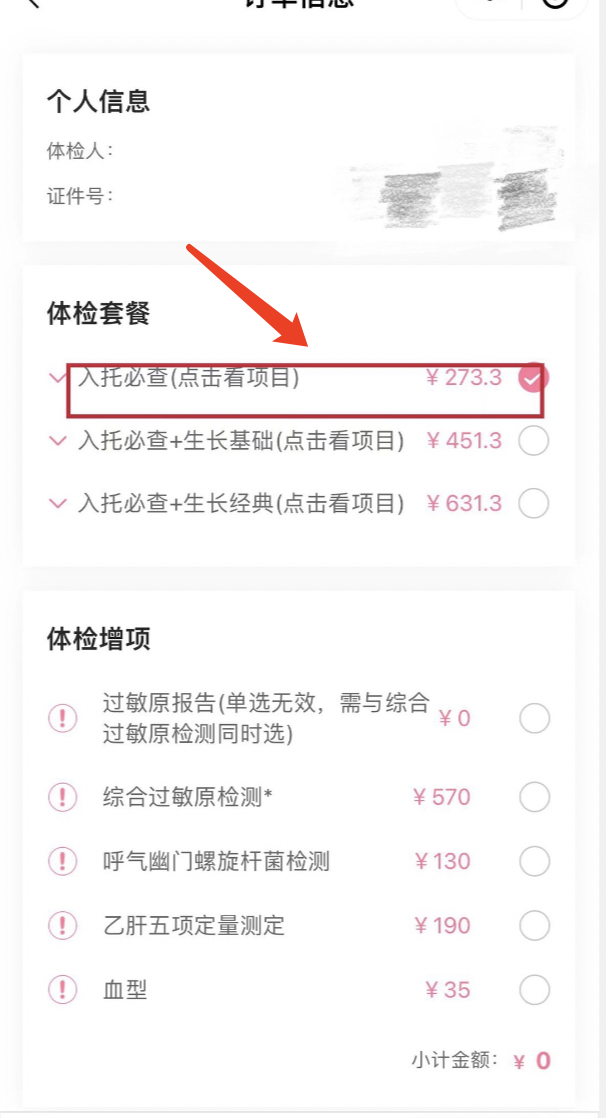 选择体检套餐:入托必查项目(如有特殊需求,可以根据自身情况选择合适项目及增项。)