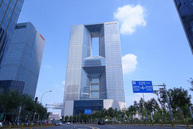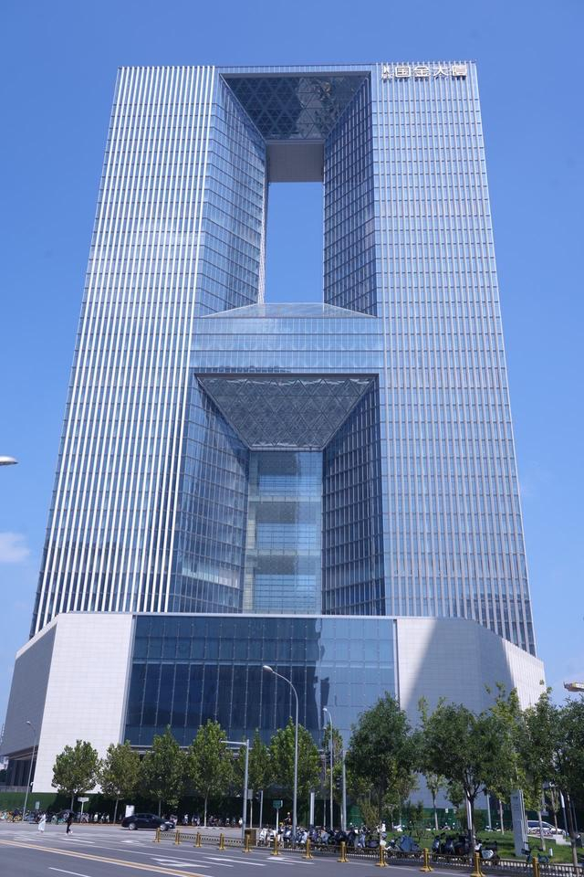 从远处看去,国金大厦为中轴对称的“双塔”式结构,两座实体塔楼分立两边,通过连廊在云端“牵手”,形成了一上一下、一虚一实、下合上开的“门式”造型,又被称为“信息之门”,看起来大气端庄。