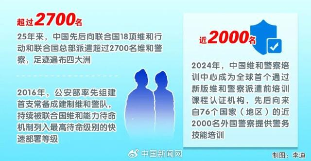 25年来,中国先后向联合国18项维和行动和联合国总部派遣超过2700名维和警察,足迹遍布四大洲。中国式现代化创造的经济快速发展和社会长期稳定两大奇迹,随着中国维和警察的足迹,为全球治理提供新的经验和借鉴。