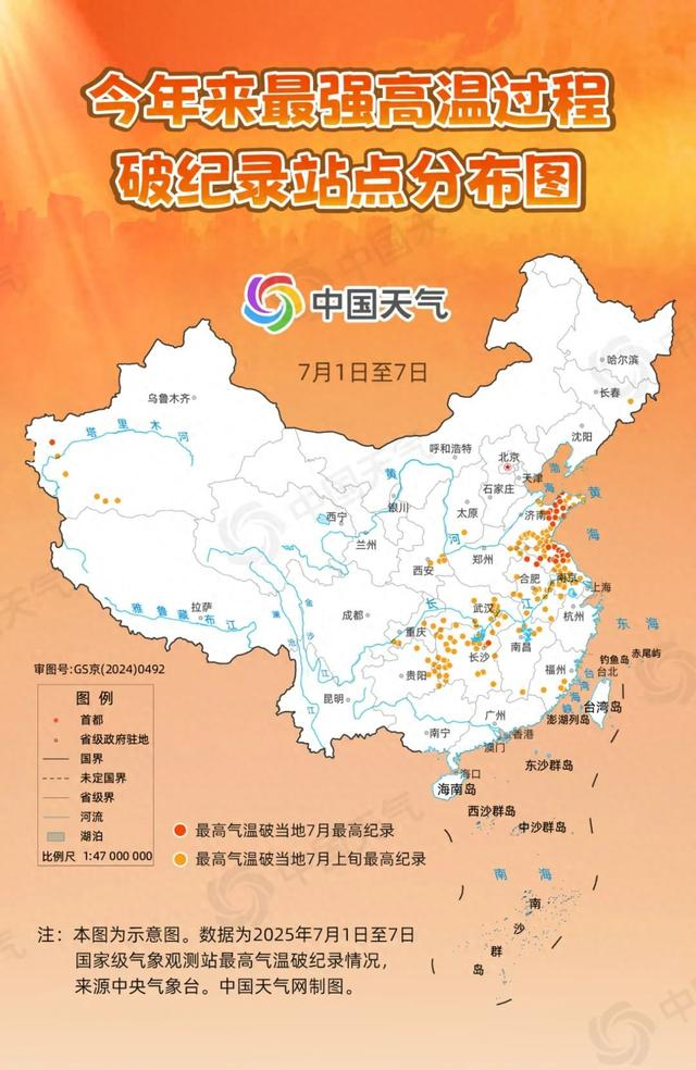 从中国天气网推出的今年来最强高温过程破纪录站点分布图来看,山东、江苏、安徽等地共有24个国家级气象观测站日最高气温打破当地7月最高纪录,像潍坊、莱州、昌邑都突破了41℃;安徽、湖北、湖南等地不少地方打破当地7月上旬最高气温纪录。