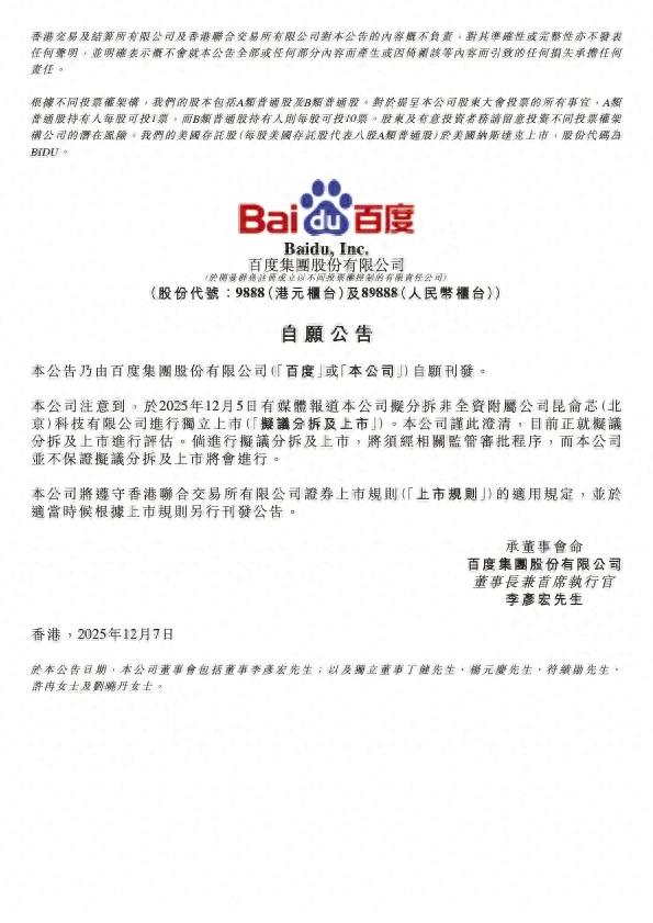 百度澄清,目前正就拟议分拆及上市进行评估。倘进行拟议分拆及上市,将须经相关监管审批程序,而公司并不保证拟议分拆及上市将会进行。