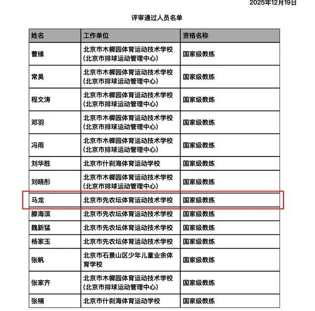 据北京市人社局网站,近日,北京市高级专业技术资格评审委员会发布公示,曹缘等14人通过了国家级教练专业技术资格评审。其中,乒乓球运动员马龙在列,获得国家级教练资格。