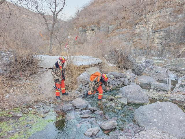 16时,消防救援人员抵达山下集结点,与斋堂镇政府工作人员、派出所民警及报警人会合,共同研判搜救路线。
