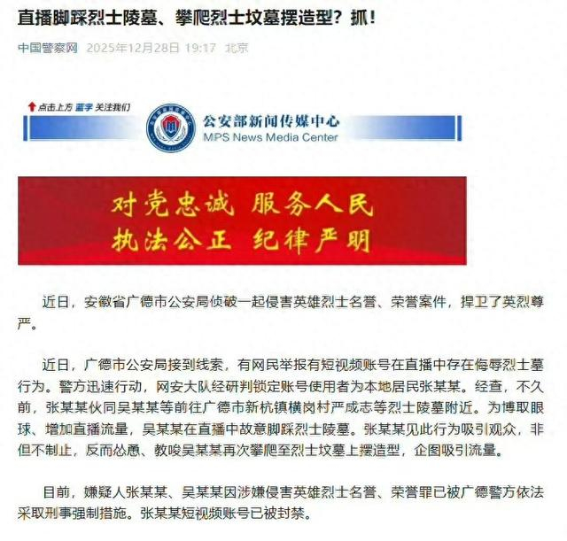 为了打败残酷的敌人,烈士们不怕流干热血;为了一点肮脏的流量,有人竟然踩在了烈士的陵墓上。据中国警察网报道,安徽省广德市公安局近日侦破一起侵害英雄烈士名誉、荣誉案。嫌疑人张某某伙同吴某某等前往烈士陵墓附近,为博取眼球、增加人气,在直播中故意脚踩烈士陵墓,甚至攀爬到烈士陵墓上摆造型。目前,张某某、吴某某因涉嫌侵害英雄烈士名誉、荣誉罪已被依法采取刑事强制措施,张某某短视频账号已被封禁。