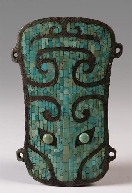 多件国宝亮相。其中,二里头夏都遗址博物馆的镇馆之宝——镶嵌绿松石兽面纹铜牌饰是展览的“封面款”。薄至毫米级的绿松石片,拼成它的“脸”;青铜质地的圆弧形框架,塑成它的“身”;光润的绿松石珠和灵动的青铜质地线条,勾勒成“睛”……这样的铜牌饰在二里头遗址仅出土3枚。这双“眼睛”见过中国最早的王朝。