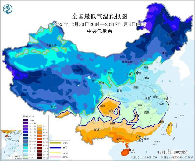 受冷空气影响,2025年12月30日夜间至2026年1月2日,我国中东部的部分地区将自北向南出现降温,陕西、山西南部、吉林中东部、河南大部、江汉、江淮、江南、西南地区东部、华南中北部等地日平均或最低气温将下降6~10℃,江南中部等地局地降温可达12~14℃。2026年1月3日早晨,最低温度0℃线将南压至江南南部。