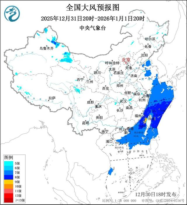 预计,12月30日20时至31日20时,新疆北部、甘肃西部、内蒙古东部、青海南部等地有5~6级大风,阵风7~8级;东海大部海域、台湾海峡、台湾以东洋面将有7~8级、阵风9~10级的大风。