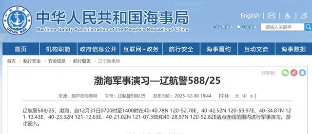 据中国海事局网站消息,渤海部分海域将进行军事演习: