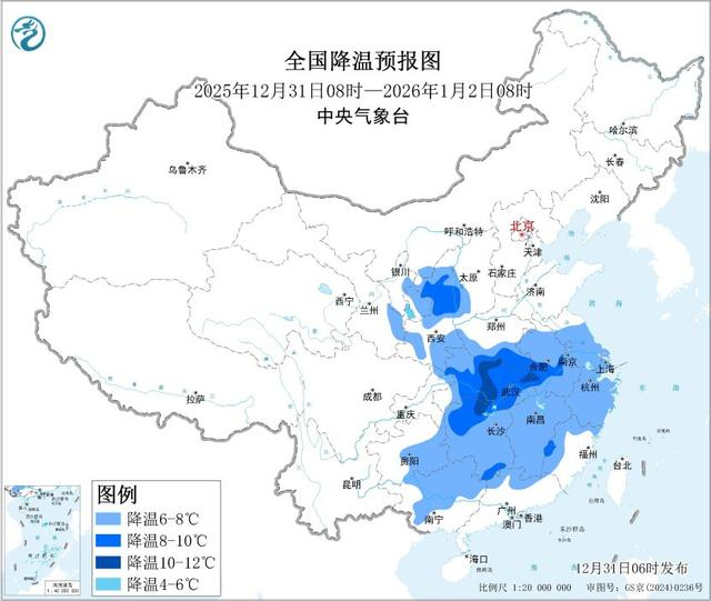 2025年12月31日08时至2026年1月2日08时,陕西大部、山西南部、河南中南部、江汉、江淮、江南、贵州东部、华南北部等地日平均或最低气温将下降6~10℃,湖北东部、湖南北部等地局地降温可达10~12℃。