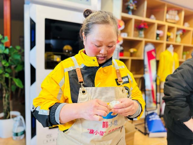 当天的饺子味道有些特别。包饺子的师傅,是西三旗街道新就业群体妇女小组的女骑手们。下午2点,女骑手们陆续抵达,大家洗净双手,褪去奔波的疲惫,便开始张罗着包饺子。她们揉面手法扎实有力,擀皮动作娴熟利落,调馅配比咸淡适中,包饺子的样式更是各有创意、别出心裁。