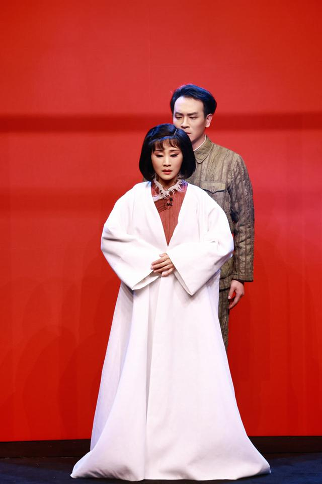 那一新/摄河北梆子《远去的白马》改编军旅作家朱秀海的同名长篇小说,是北京演艺集团艺术生产孵化平台的成果之一。《远去的白马》以“白马”为核心意象,通过一位普通的胶东妇女赵秀英跌宕起伏的一生,深刻诠释了“人民是历史的创造者,是真正的英雄”的宏大命题。原作小说长达32万字,罗周、安凤英、李石条、朱维英、刘杏林等一线艺术家组成的主创团队发挥戏曲及舞台艺术的特质,提炼了爱情、战斗、选择三条主线,让作品基调更加浪漫化、诗意化。舞台上,极简造型的巨大弧形墙矗立,粗粝质感无声诉说着战争的沧桑与岁月的沉重,灵动的红色线条和转台框架切割舞台空间,结合光影变化,勾勒出战火纷飞中的历史印记和人们心中永不磨灭的热血。