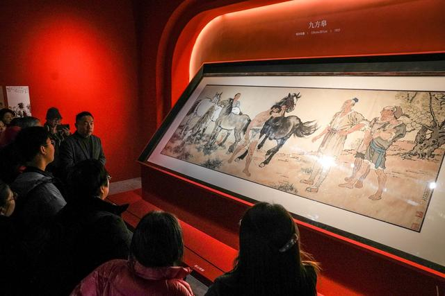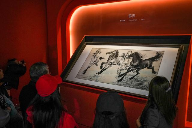 随着“奔腾尺幅间——馆藏马主题精品展”拉开帷幕,徐悲鸿收藏的元、明、清等时期古画,及其代表作《九方皋》《群奔》等50余幅艺术珍品集中亮相。马鬃飞扬、四蹄腾空的瞬间被定格在画纸上,近看能清晰感受到笔触的动感。一幅幅画作以时间为轴,完整展现徐悲鸿奔马创作的演变轨迹,带领观众步入波澜壮阔的视觉之旅,感受一笔一墨间蕴藏的生命律动。