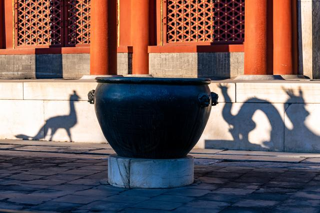临近新年,天还未亮透,摄影师马涛和朋友已经裹着厚外套,站在仁寿殿外的拍摄机位前等待。早8时许,金色的光线斜照在铜龙、铜凤上,它们投射出的影子缓缓落在石质基座上。随着晨光的推移,铜龙、铜凤的影子在铜缸两侧一左一右对称分布,一幅“龙凤呈祥”的光影奇观出现在镜头中。马涛和旁边的摄影爱好者连拍数张,用镜头定格下这冬日限定的美好。