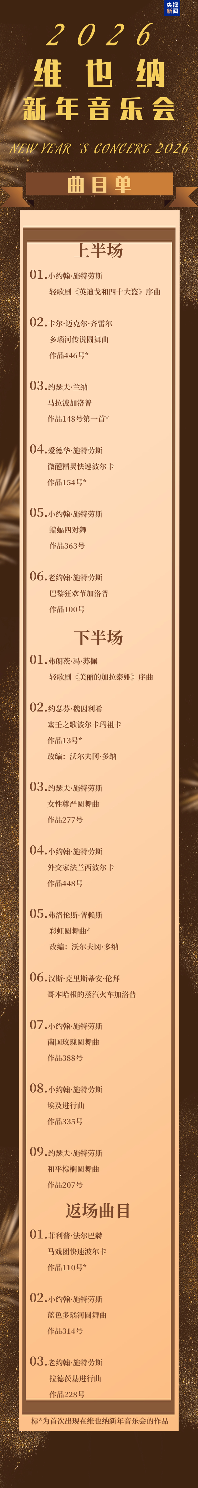 在指挥家雅尼克·涅杰-瑟贡的加入下,今年音乐会的曲目可谓丰富多元、充满活力,有五首首演作品,更是在维也纳新年音乐会历史上首次出现两位女性作曲家的作品。主持人尼格买提还将前往维也纳带来对指挥家雅尼克·涅杰-瑟贡、维也纳爱乐乐团主席丹尼尔·弗洛绍尔的独家采访,以及排练期间的独家花絮。让我们以不朽的乐章,织就2026年的锦绣;让希望随旋律生长,让时光在共鸣中永恒!