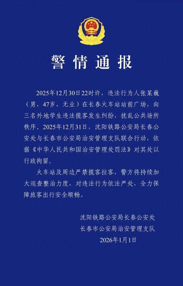 长春警方1月1日通报,2025年12月30日22时许,违法行为人张某巍(男,47岁,无业)在长春火车站站前广场,向三名外地学生违法揽客发生纠纷,扰乱公共场所秩序。2025年12月31日,沈阳铁路公安局长春公安处与长春市公安局治安管理支队联合行动,依据《中华人民共和国治安管理处罚法》对其处以行政拘留。