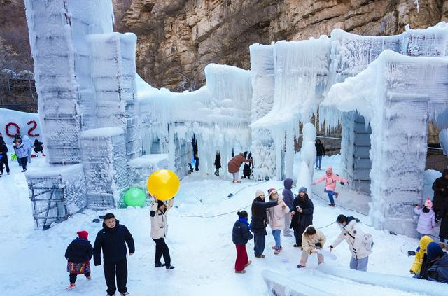 拾级而上,走进京东大峡谷深处,山间仿佛变成了童话中的冰封世界。百米冰瀑从山崖垂落,晶莹剔透,引得游客纷纷拍照。冰雕师用冰雪雕琢出迷宫,孩子们嬉笑着捉迷藏,娇艳的红玫瑰冻在冰块中,是情侣打卡的好选择。