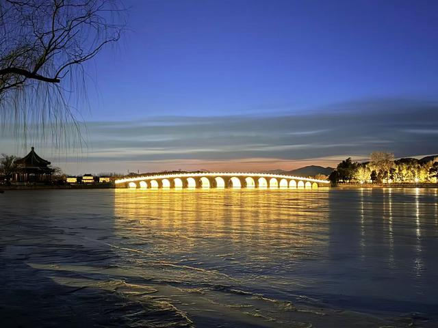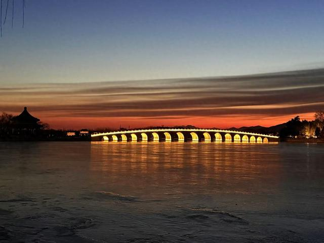 十七孔桥的灯光打在冰面上焕发出晶莹的光彩 温红征 摄