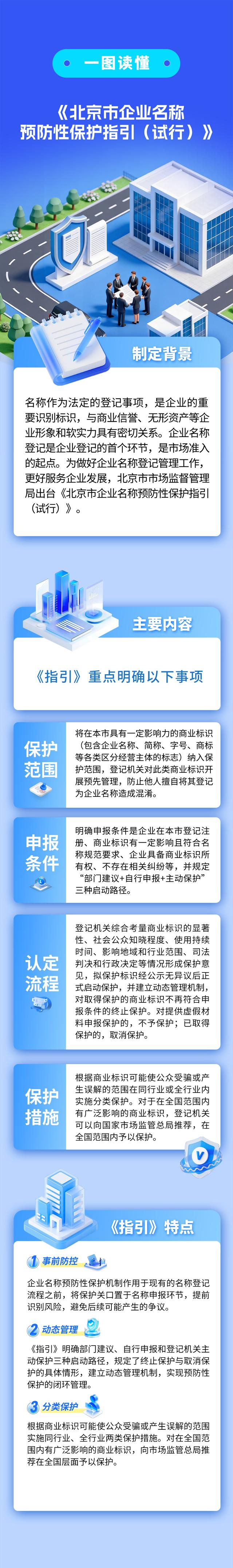 名称作为法定的登记事项,是企业的重要识别标识,与商业信誉、无形资产等企业形象和软实力具有密切关系。企业名称登记是企业登记的首个环节,是市场准入的起点。为做好企业名称登记管理,更好服务企业发展,市市场监管部门开展企业名称预防性保护,出台《北京市企业名称预防性保护指引(试行)》
