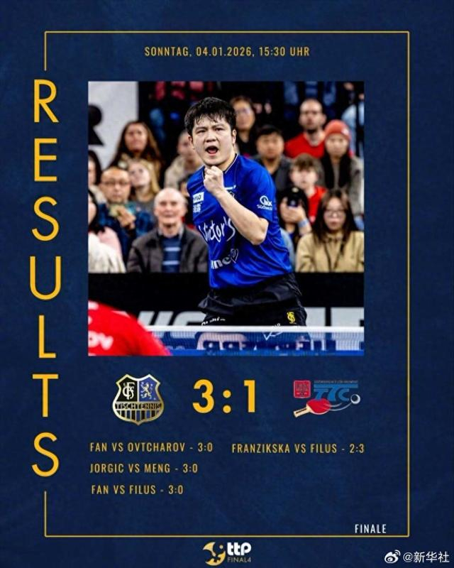 乒乓球德国杯决赛萨尔布吕肯vs富尔达马伯策尔,第四盘樊振东3-0战胜菲卢斯,决赛再次独得两分,帮助萨尔布吕肯总比分3-1战胜对手,夺得德国杯冠军。