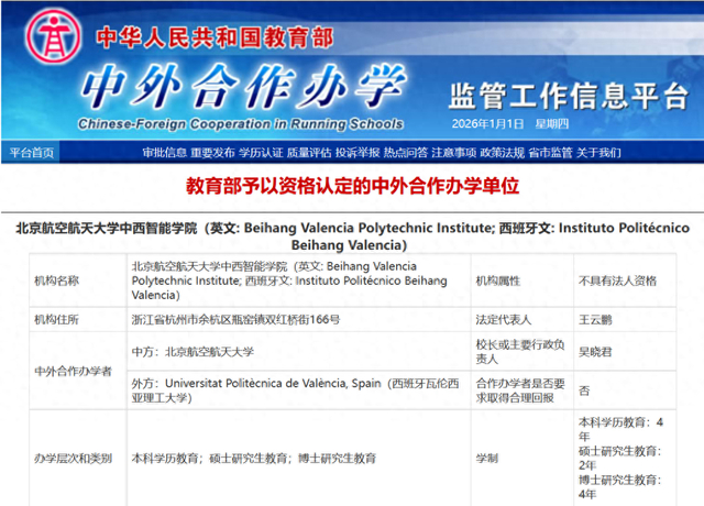 近日,经教育部批准,北京航空航天大学与西班牙瓦伦西亚理工大学合作设立北京航空航天大学中西智能学院。该学院以“中外理工科学生趋同培养”和全英文授课为办学特色,开展本科、硕士、博士学历教育,办学总规模为1500人(含国际学生500人)。