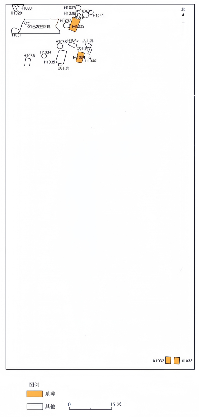 △(图二)发掘区遗迹平面分布图现将其中4座小型墓葬M1032、M1033、M1034、M1035、马坑H1035、灰坑H1041及灶Z1的发掘情况公布。