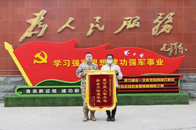 1月4日,新年第一个工作日,武警北京总队某部营区内暖意融融。失主张雨女士委托家人专程来到这里,将感谢信和一面印着“拾金不昧显军魂 最可爱人彰本色”的锦旗送到战士张卫国所在中队,以此感谢他休假期间拾获并及时归还救命药的暖心举动。