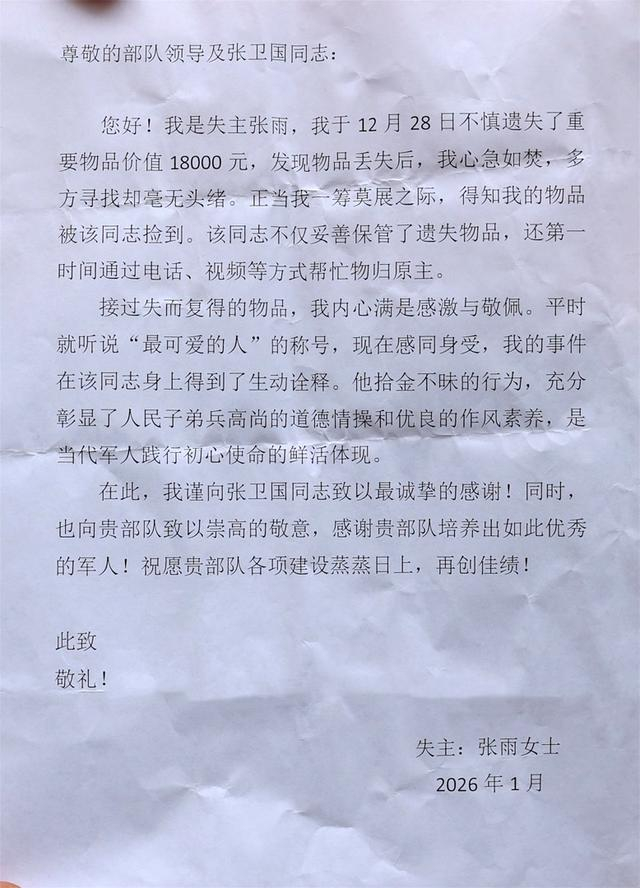 收到失而复得的物品,张雨女士满是感激与敬佩。她在感谢信中说:“平时就听说‘最可爱的人’的称号,现在感同身受。”收到锦旗的张卫国谦逊地说:“这只是我应该做的小事,作为一名军人,守护群众的财产安全、为群众排忧解难本就是职责所在。今后我会继续坚守岗位,不辜负部队的培养和群众的信任。”
