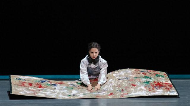 《她的龟兹》制作人、主演古丽米娜,是中央民族舞蹈学院大学教授,亦曾是舞剧《五星出东方》中令人印象深刻的女主角。此次在《她的龟兹》中亮相,她并未局限于呈现观众刻板印象里的“新疆舞”,而是以鲜明的现代舞风格登场。手持画布出场的她,通过多元的舞步,将画布舞出如魔毯般变幻的效果。