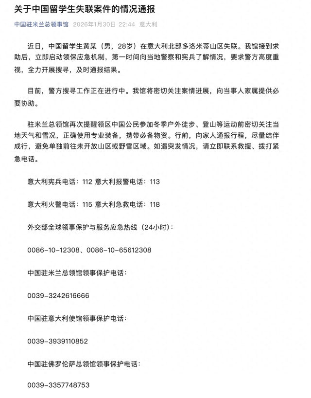 1月30日,中国驻米兰总领事馆针对此事发布情况通报称,总领馆接到求助后,立即启动领保应急机制,第一时间向当地警察和宪兵了解情况,要求警方高度重视,全力开展搜寻,及时通报结果。