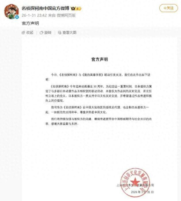 声明称,1月31日,《名侦探柯南》与《我的英雄学院》联动引发关注。在此作出如下说明: