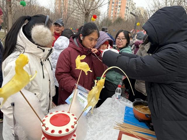 三乐花园社区“骏驰贺岁,金马迎春”马年非遗新春庙会同样热闹非凡。西华府小区活动现场同样气氛热烈,非遗体验区尤为引人关注。葫芦烫画、传统面人、老北京糖画等摊位前,非遗艺人们现场展示精湛技艺,吸引众多居民驻足观看。现场还设置了拓印、毛笔字书写等互动体验环节,让居民在亲身参与中领略传统文化魅力,进一步加深对非物质文化遗产的理解与认同。