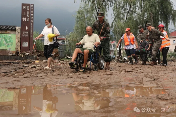 7月28日7时起,武警北京总队官兵协助平谷区镇罗营镇关上村1600名受灾群众转移,部队到达后第一时间展开救援行动,疏通救援通道,搬运生活物资、设置安置场地、护送转移生活不便的老人、解决群众生活困难。白继开摄