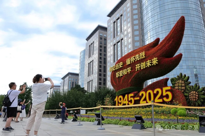 8月23日,长安街沿线东单路口,“纪念中国人民抗日战争暨世界反法西斯战争胜利80周年”主题花坛吸引行人驻足拍照。常一鸣摄