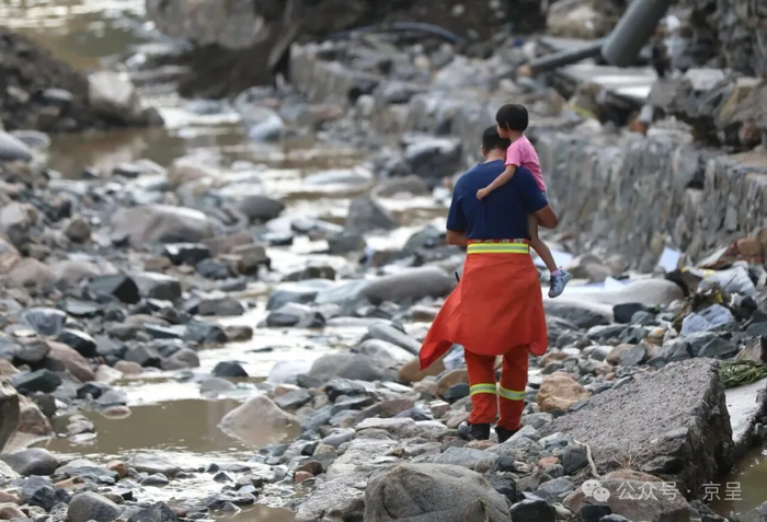7月29日傍晚,经历数日极端强降雨后,怀柔崎峰茶村唯一外联道路终于抢通。大兴消防的救援队伍徒步进入深山区,护送被困村民向安置点转移。一名消防员怀抱年幼儿童,在洪水退去后的泥泞道路上稳步前行。 甘南摄