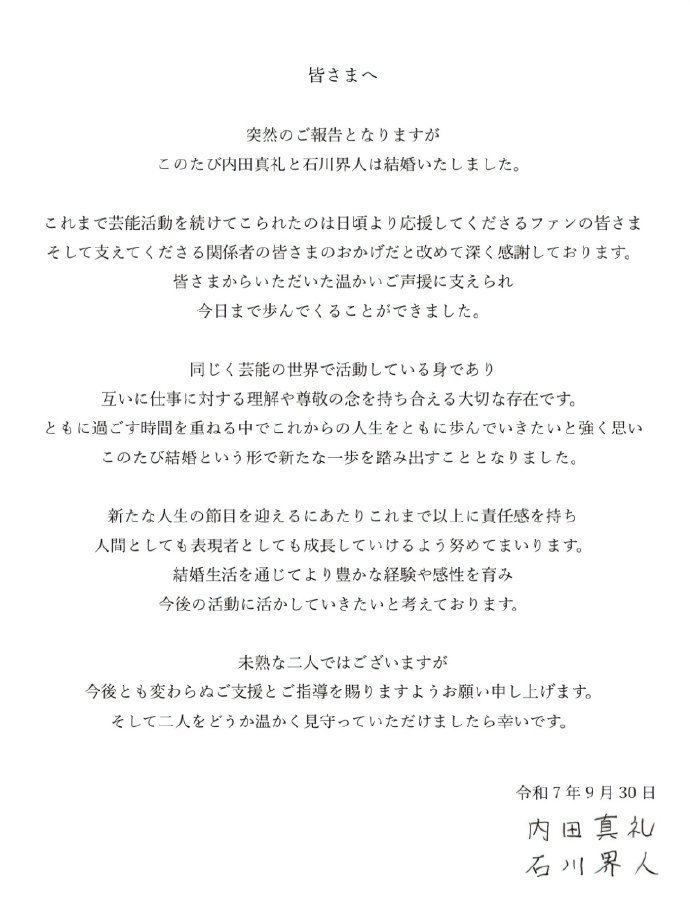 声优「内田真礼」与「石川界人」于今日宣布结婚,并通过社交媒体平台发布手写信,强调结婚决定是经过慎重考虑的人生新阶段。