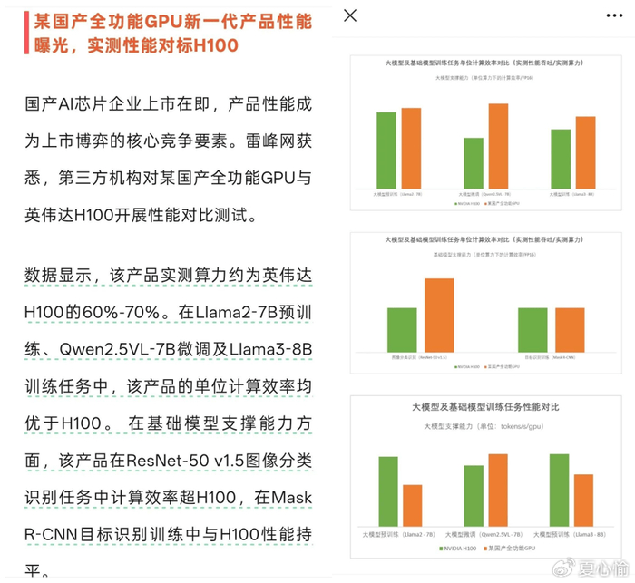 外界已经有了一些爆料,甚至外媒都很关注。像雷锋网就拿到过测试数据:S5000大模型支撑能力,Llama2-7B预训练、Qwen2.5VL-7B微调及Llama3-8B训练三类任务中,S5000的单位计算效率均超过H100。