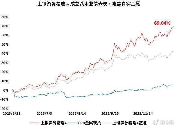 权益产品业绩当然最重要。以万得数据参考,产品A类份额成立以来累计收益率达69.04%,远胜现货金属价格及业绩比较基准,在年内可谓表现亮眼。(注:数据来源见下)