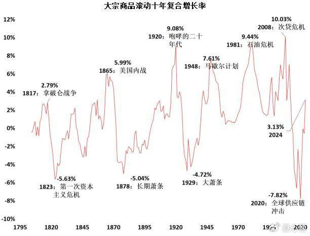 注:数据来源Warren&Pearson Commodity Index(1795-1889),BLS WPI Commodities Index(1890-1968),FRED All Commodities Producer Price by Commodity(1969-1993),RJ/CRB Commodity Index(1994-2024),雅各布﹒范杜因《创新随时间的波动》,周金涛《涛动周期论》,Joseph A.Schumpeter. Bussiness Cycles: A Theoretical, Historical and Statistical Analysis of the Capitalist Process, 1939:P211,历史过往仅供参考,不预示未来表现。