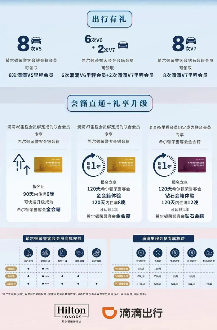 先说干货。如果您是希尔顿荣誉客会或滴滴里程会员,恭喜,您的体验升级了。以上两大会员体系的权益实现互通,具体请见下图: