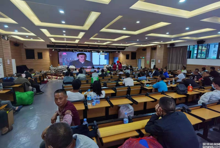 为丰富安置点工人文化生活,在文华学校安置点,科技园社区工作站组织工人们在南外文华学校阶梯教室观看红色电影,以供避险群众休闲打发时间。