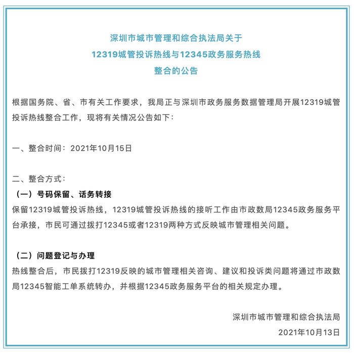 读特客户端·深圳新闻网2021年10月15日讯(晶报记者 郑乐琦)记者从深圳市城市管理和综合执法局获悉,10月15日起市民可通过拨打12345或者12319反映城市管理相关问题。
